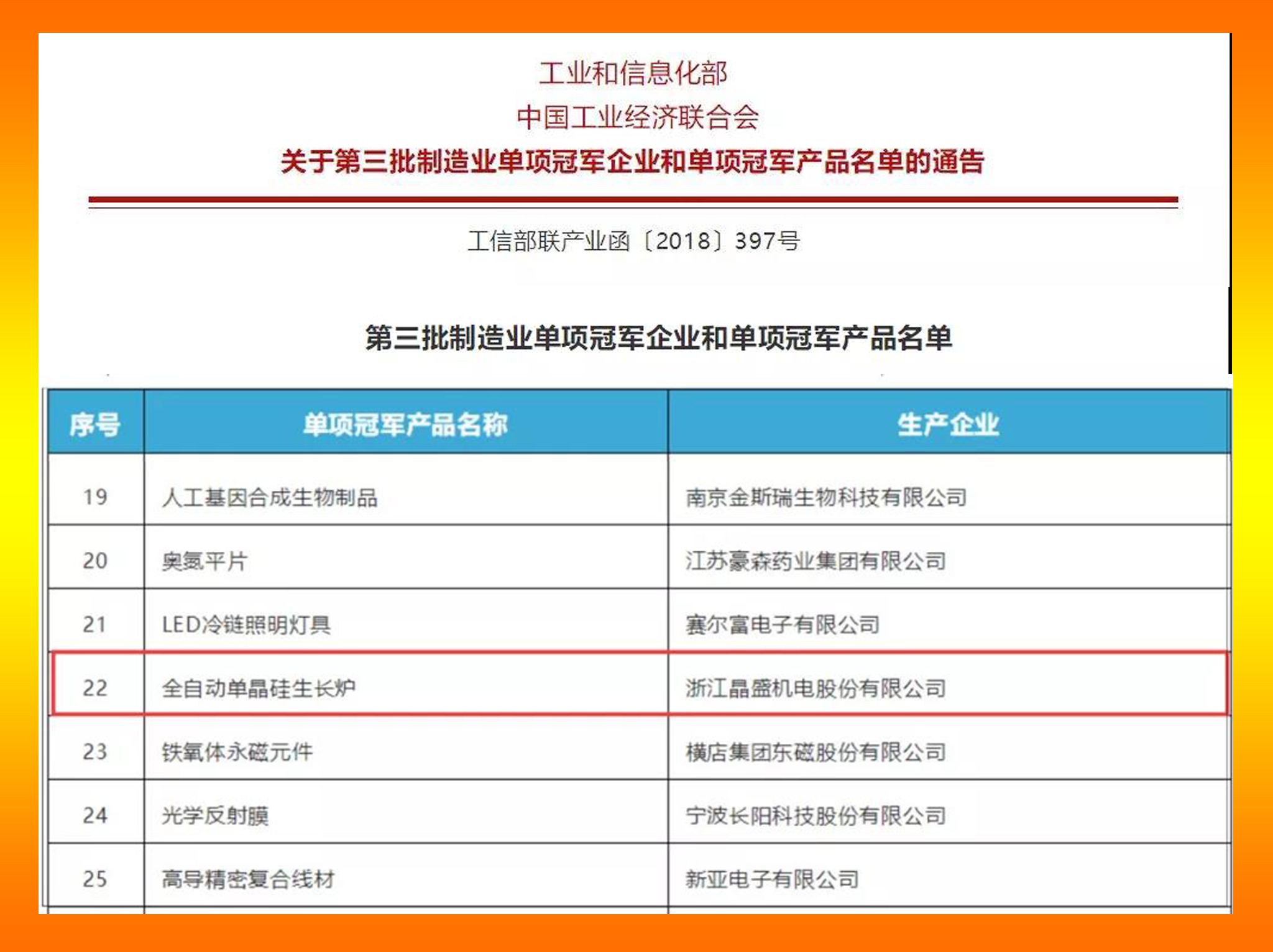 11月9日,中国工业和信息化部与中国工业经济联合会联合公布了第三批制造业单项冠军企业和单项冠军产品名单,晶盛机电生产的全自动单晶硅生长炉入选“单项冠军产品”名单。